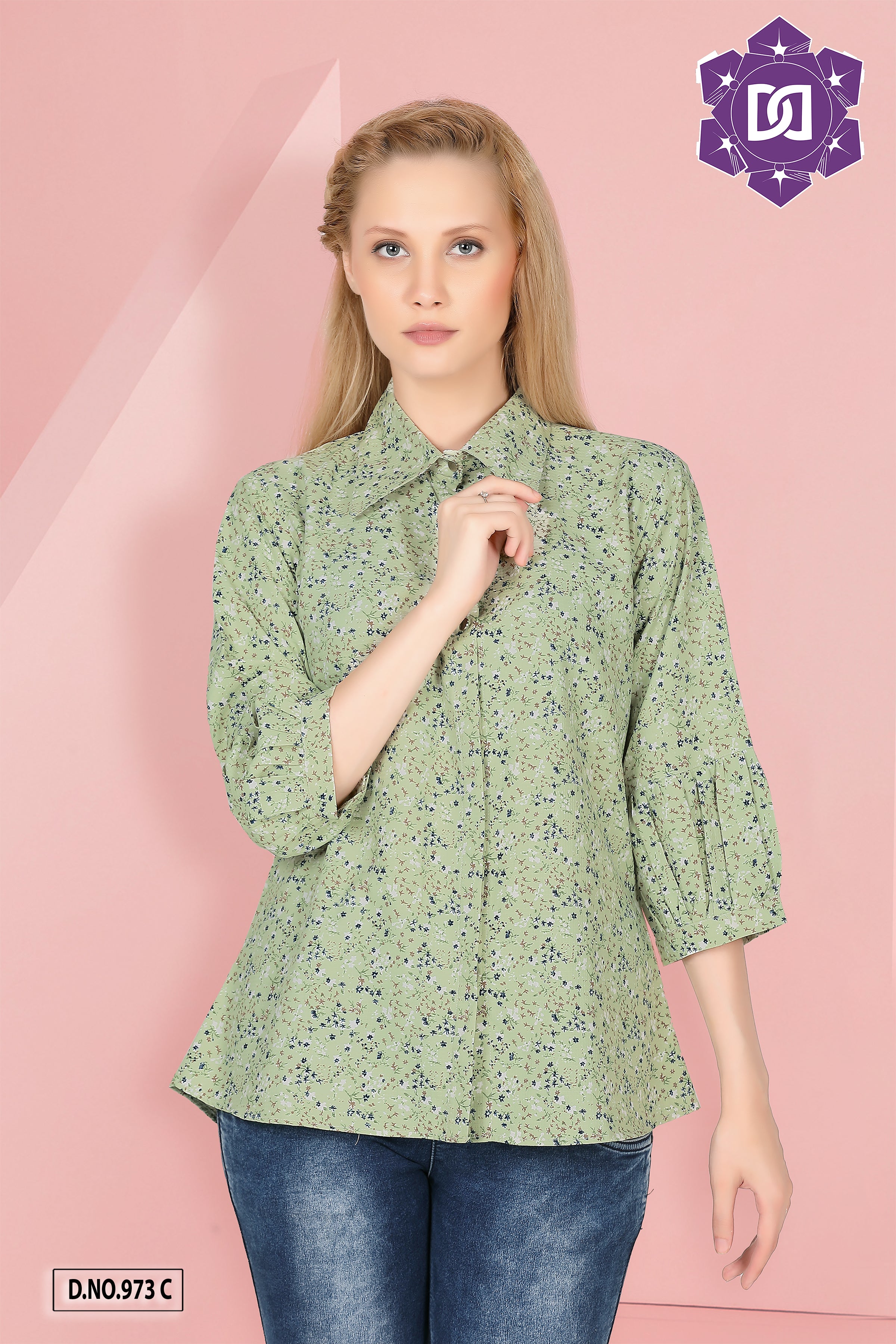 WOMENS FLORAL PRINT FLY COLLAR SHIRT WITH BISHOP SLEEVES - GREEN