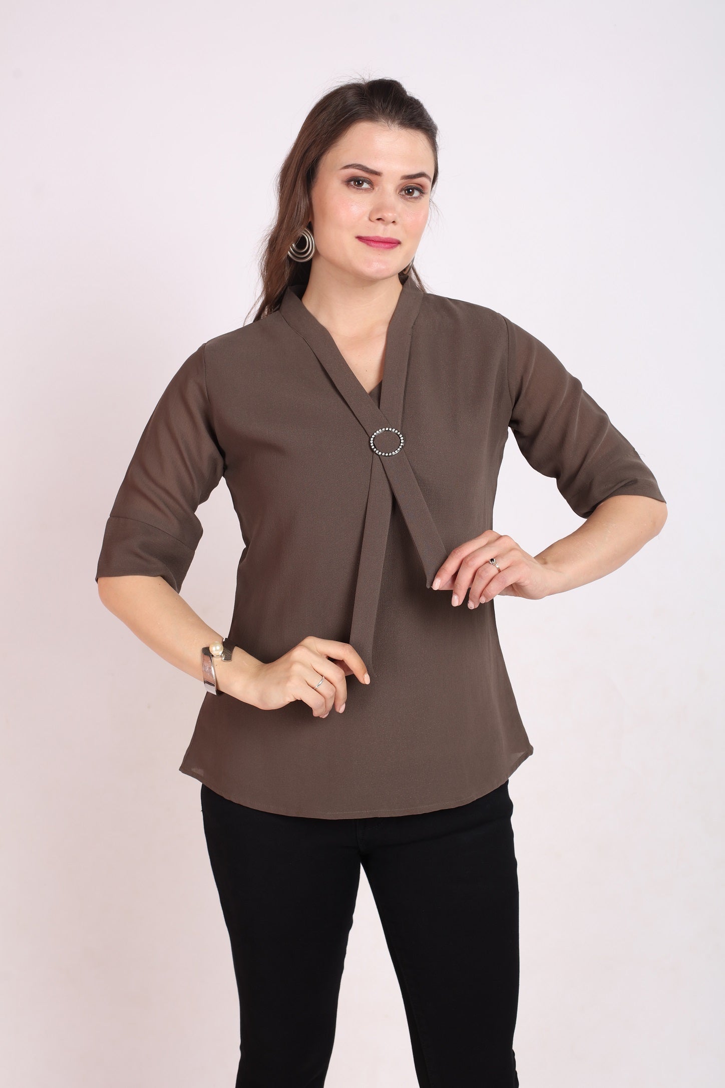 Elevate your wardrobe with our Women's Solid Grey Top! Made of crepe, this trendy top features a stylish tie neck and half sleeves for a look that's both chic and comfortable. The regular length adds a touch of sophistication to any outfit, making it a must-have for your fashion-forward wardrobe.